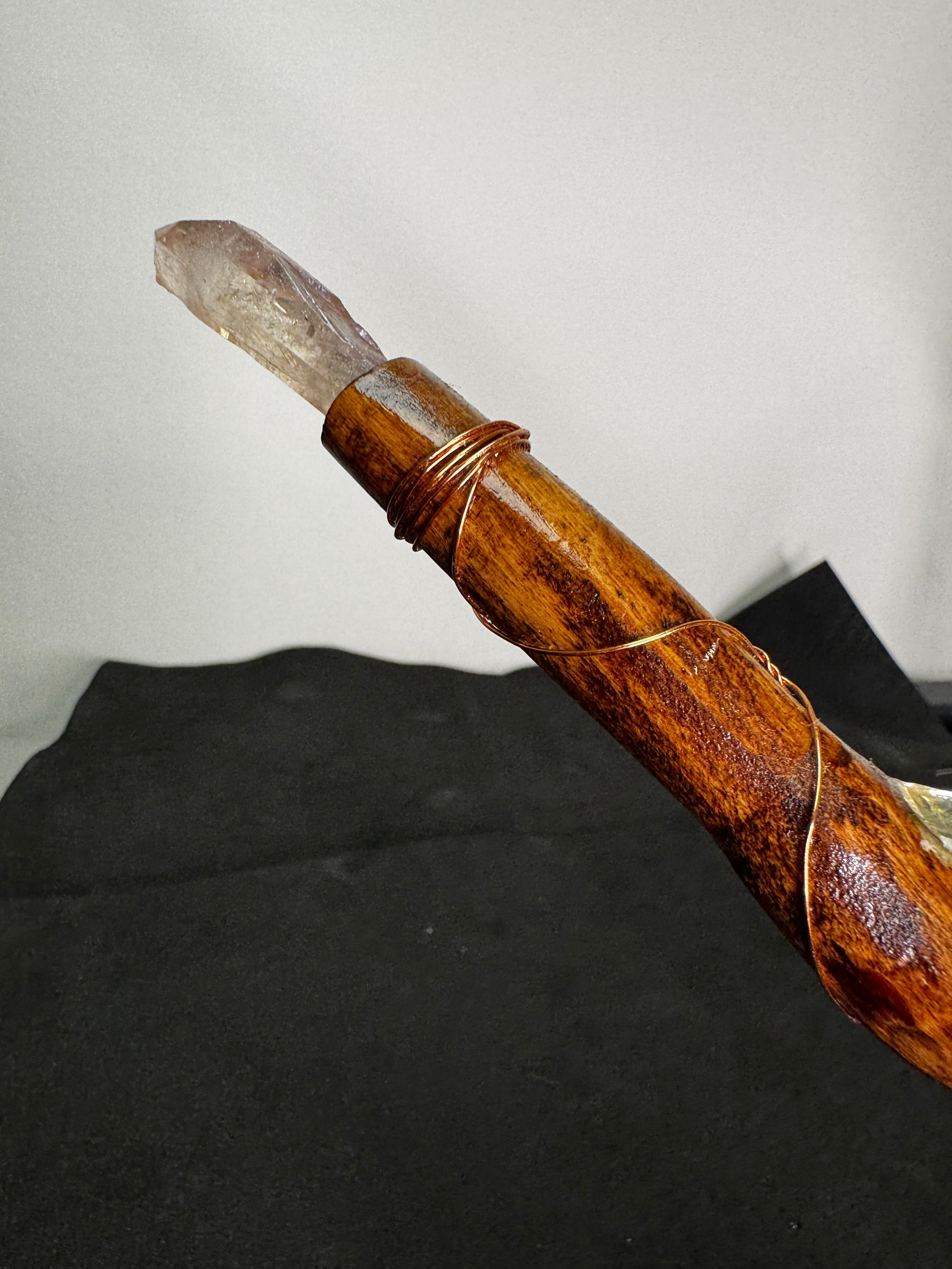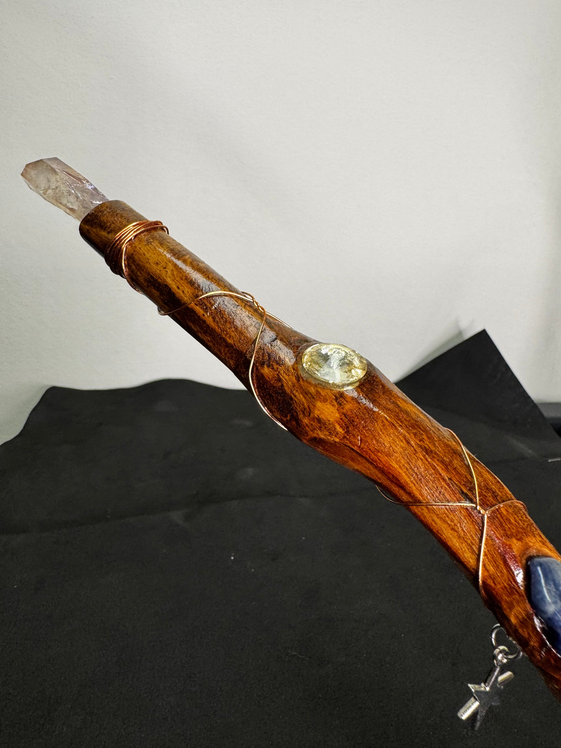 Each wand is handmade from wood carving and leather craftsmanship. Each stone is placed with intention. You will receive the exact wand posted in each listing.