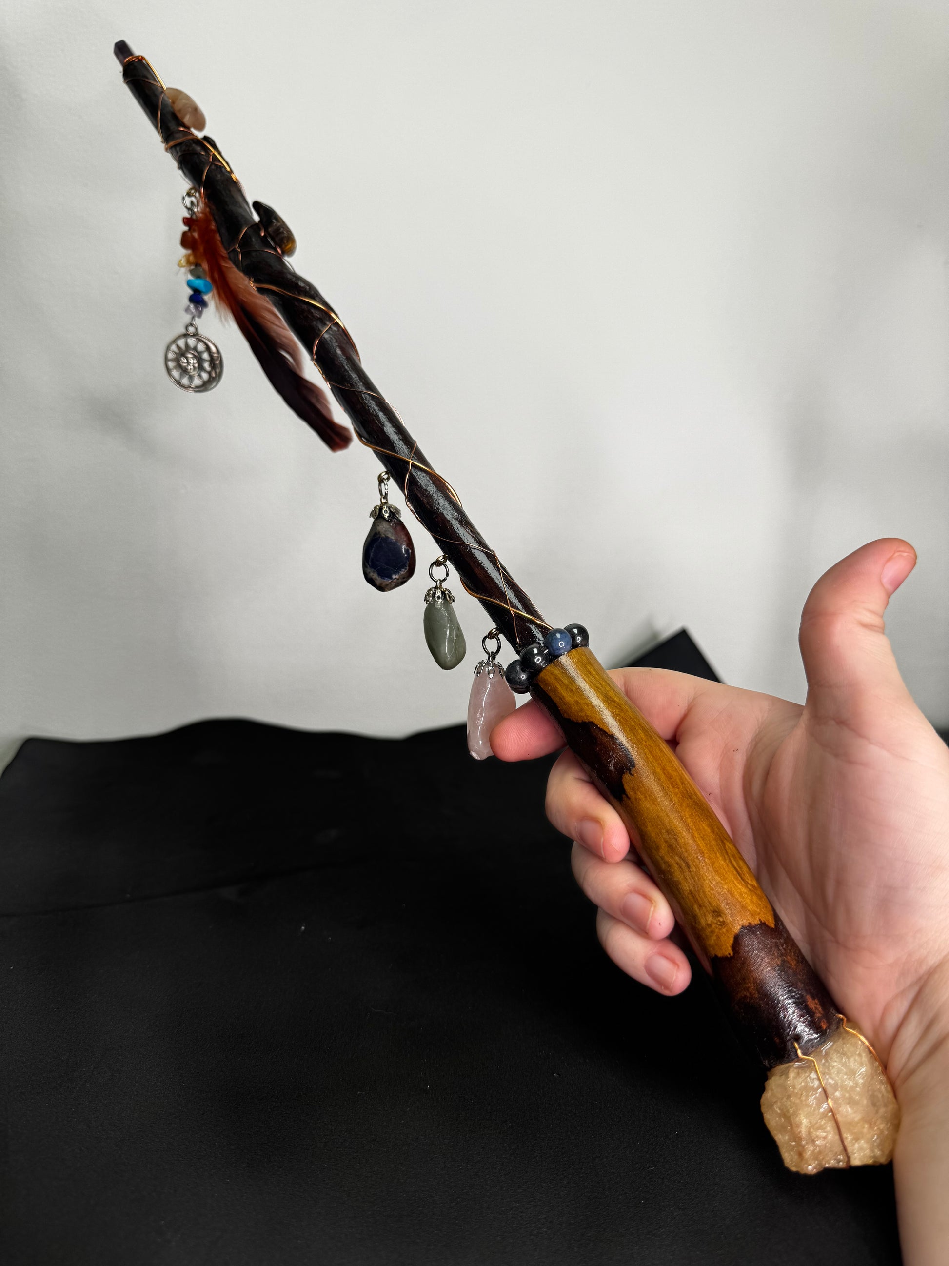 Each wand is handmade from wood carving and leather craftsmanship. Each stone is placed with intention. You will receive the exact wand posted in each listing.