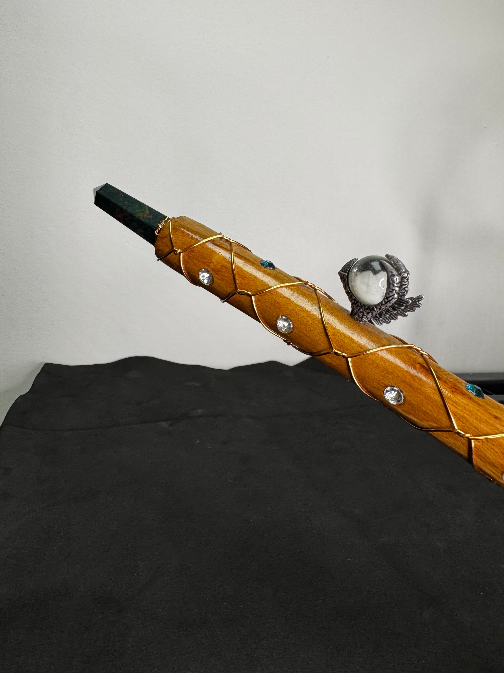 Each wand is handmade from wood carving and leather craftsmanship. Each stone is placed with intention. You will receive the exact wand posted in each listing.